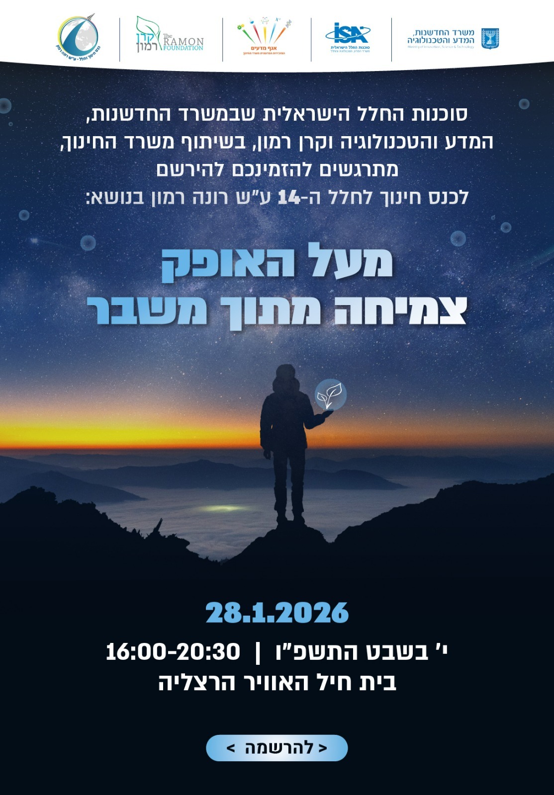 סוכנות החלל הישראלית במשרד החדשנות, המדע והטכנולוגיה וקרן רמון, בשיתוף משרד החינוך, מתרגשים להזמינכם להירשם